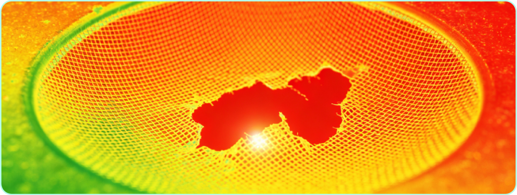 The algorithm automatically identifies abnormal temperature regions, which typically correspond to damaged areas of the screen mesh.
