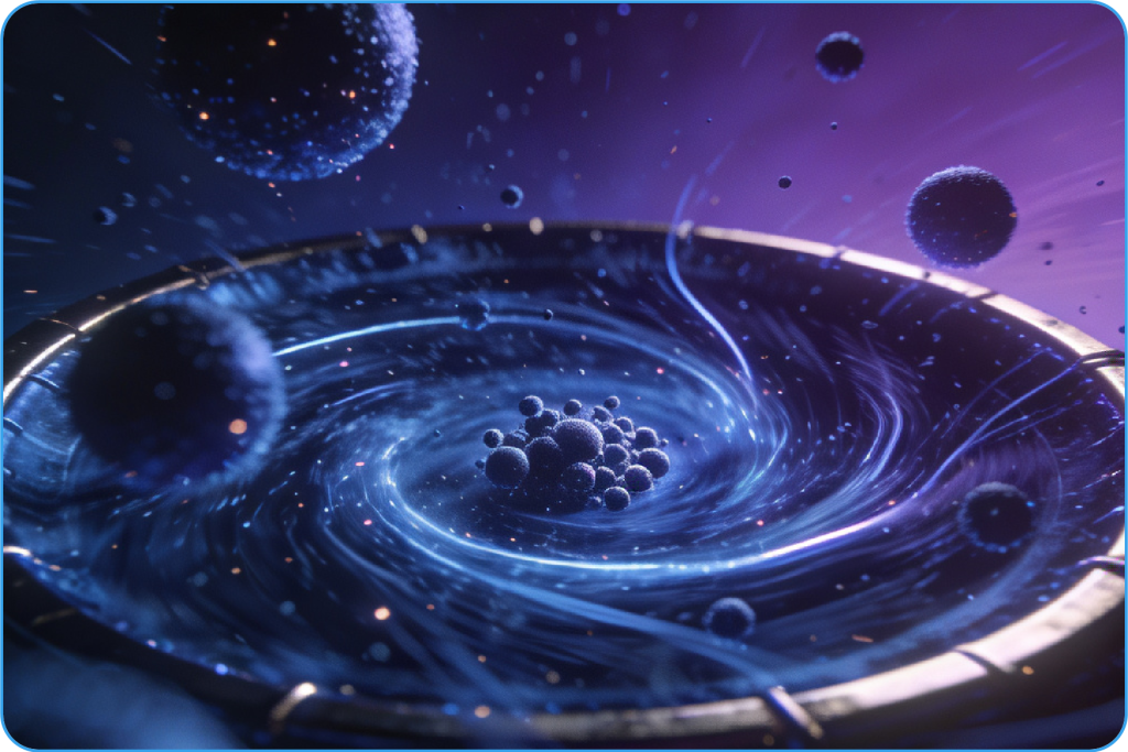 • High-Energy Field Deagglomeration: Intense energy fluctuations break apart agglomerated nanoparticle structures.
